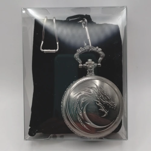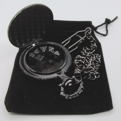 Metal pocket dice case with polyhedral mini-kit: majestic portrait - silver in a black suedecloth pouch